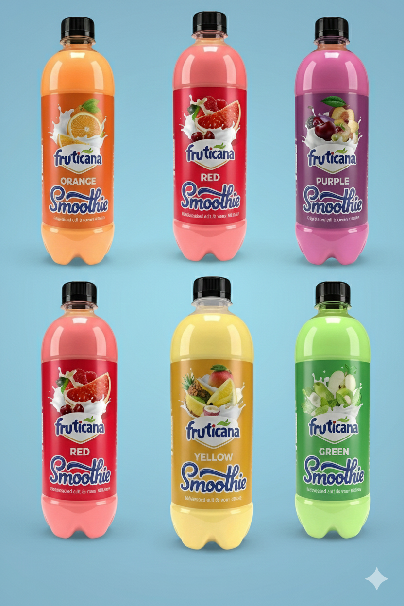 Tags: Fruticana, Smoothie, Fruit Drink, Bottled Beverage, Yogurt Drink, Orange Smoothie, Green Smoothie, Red Berry Smoothie, Tropical Smoothie, Purple Smoothie, Plastic Bottle, 12-Pack Case, Wholesale Drink, Refreshing, Real Fruit Flavors, Summer Drink, Product Mockup, Beverage Packaging.